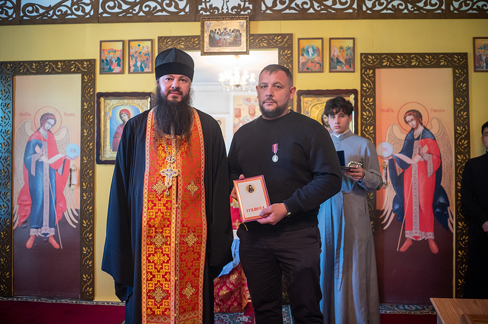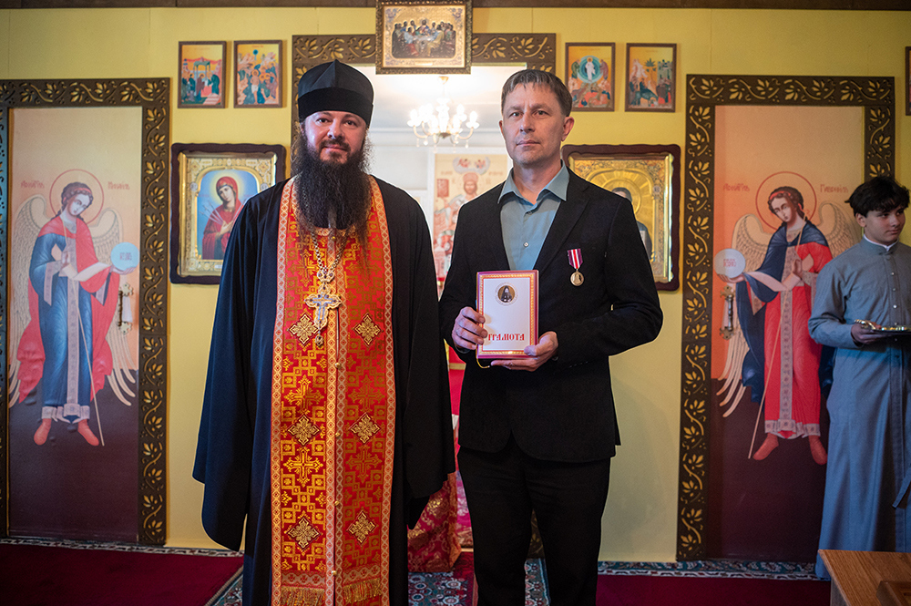Так, по окончании молебного пения иеромонах Геннадий вручил епархиальные награды благодетелям прихода.