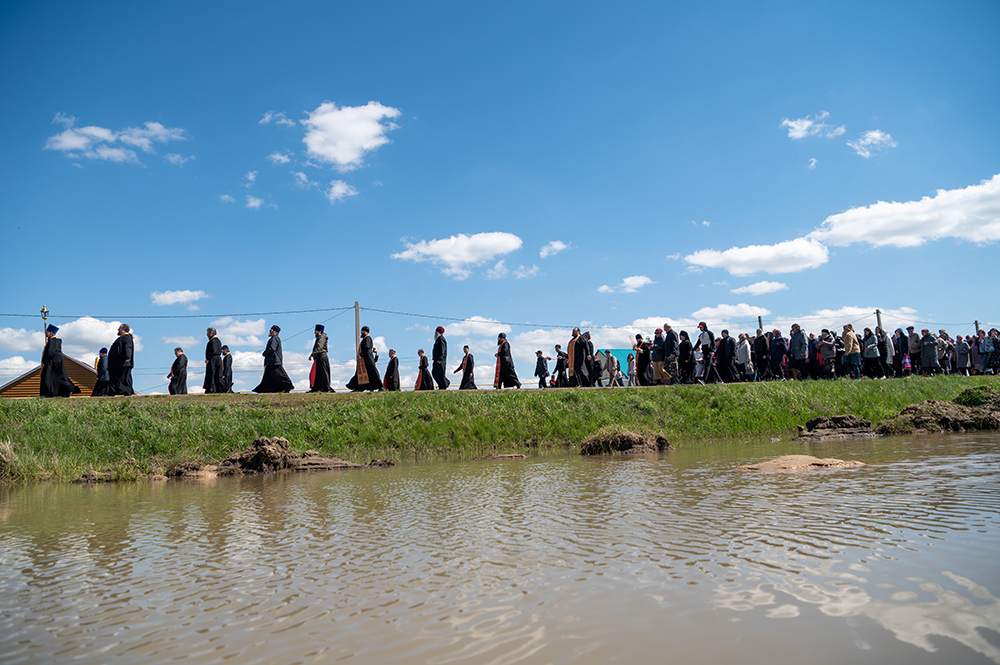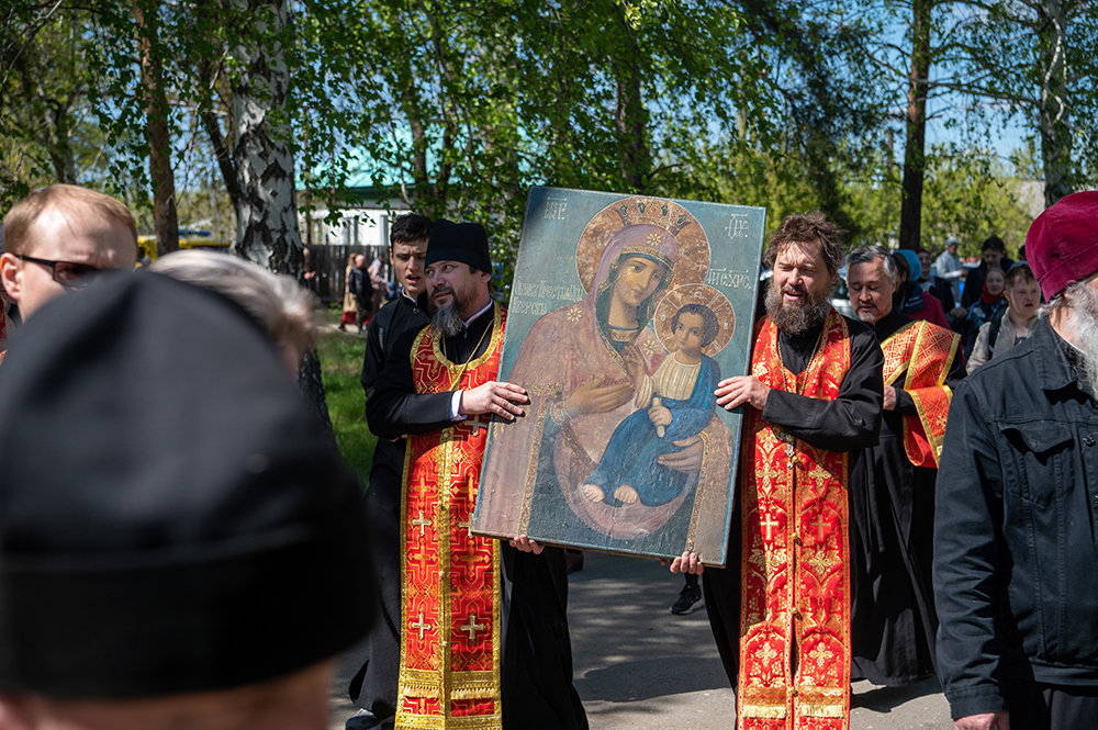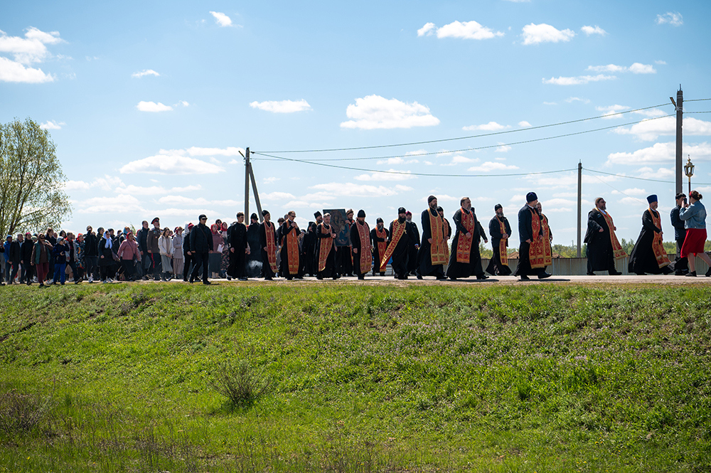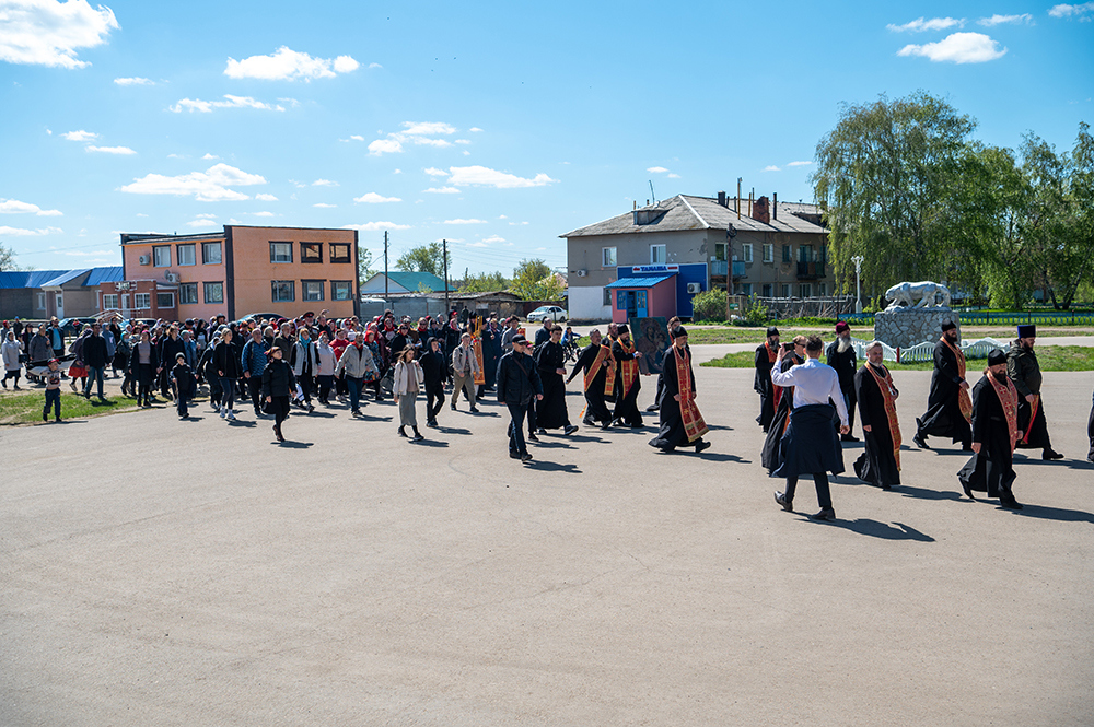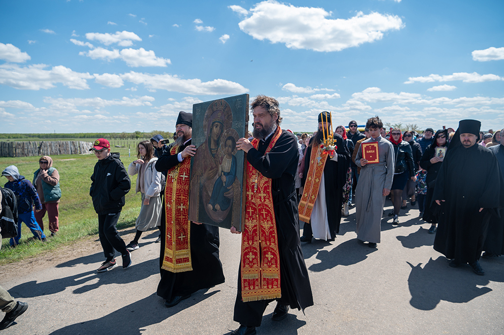 По окончании Богослужения духовенство и паломники отправились в село Октябрьское. От въезда в населенный пункт к храму Петра и Павла был совершен Крестный ход с Иверской иконой Божией Матери, которую доставили из Никольского храма в восстанавливаемую обитель для духовного укрепления верующих и молитвенного поклонения.