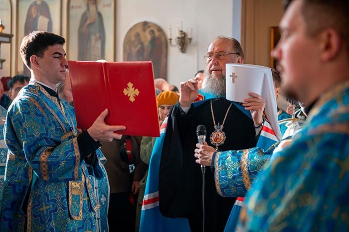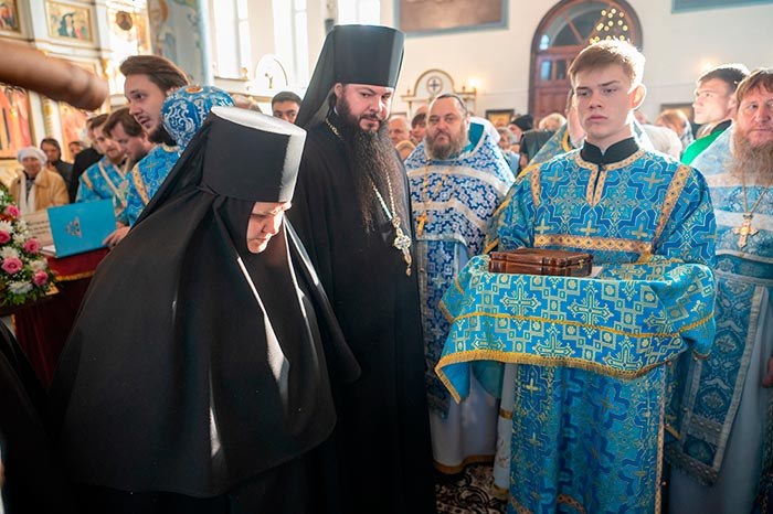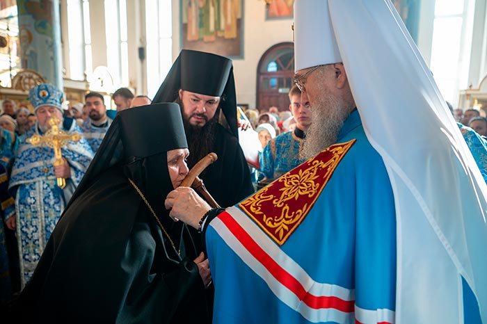 После прочтения молитв иерарх возложил на настоятельницу монастыря наперсный крест и вручил ей игуменский посох.