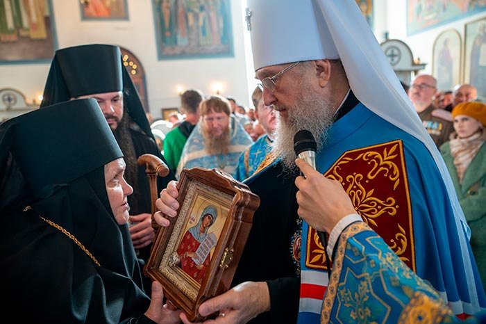 В благословение на труды Его Высокопреосвященство преподнес матушке икону с частицей мощей святой мученицы Ники Коринфской – небесной покровительницы настоятельницы Иверско-Петропавловского женского монастыря.